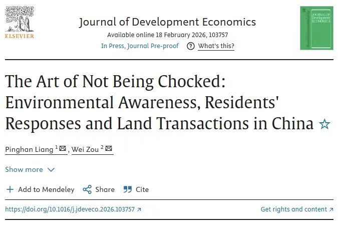 近日,中南财经政法大学财政税务学院邹伟老师及其合作者完成的论文“The Art of Not Being Chocked: Environmental Awareness, Residents' Responses and Land Transactions in China”被发展经济学顶级期刊Journal of Development Economics接收录用。该文是学院“国际化、强特色、创一流”的学科建设之路上产出的重大标志性成果,为我院“十五五”时期高质量发展创造了良好开局。
