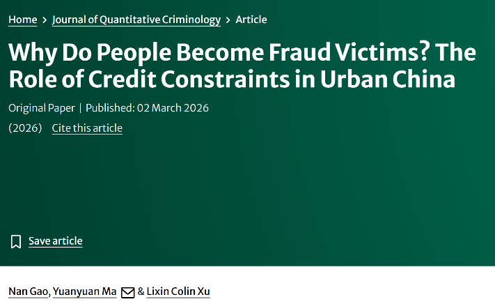 近日,中南财经政法大学财政税务学院马媛媛教授(通讯作者)与合作者(高楠,中南财经政法大学;徐立新,长江商学院)完成的论文“Why Do People Become Fraud Victims? The Role of Credit Constraints in Urban China”在国际权威期刊Journal of Quantitative Criminology正式发表。该期刊是社会科学领域的国际知名SSCI期刊,具有广泛的国际学术影响力。