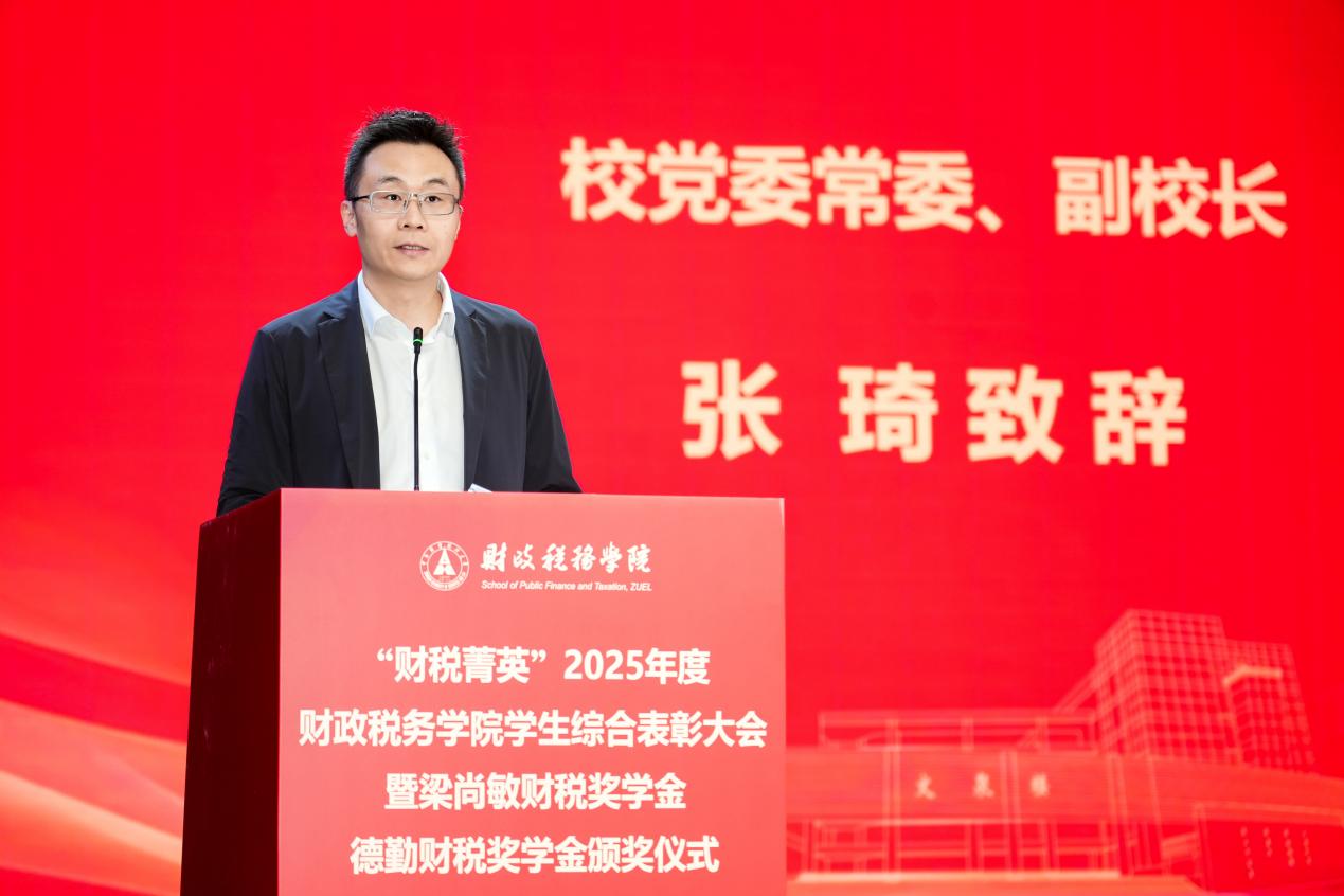 张琦副校长致开幕辞。他首先代表学校,向长期以来关心支持学校事业发展的社会各界人士致以衷心的感谢。张琦以"传承、创新、合作"三个关键词为核心,全面肯定了财政税务学院过去一年在学科建设、人才培养、社会服务等方面取得的显著成效。他特别指出,学院始终传承梁尚敏先生的治学精神与育人理念,不断深化校企合作,与德勤等行业龙头企业携手构建协同育人体系,成果丰硕。最后,他勉励全体师生主动抢抓人工智能发展的时代机遇,以“五育并举”践行“博文明理、厚德济世”的校训精神,在教育强国建设的伟大征程中奋力书写中南大篇章。