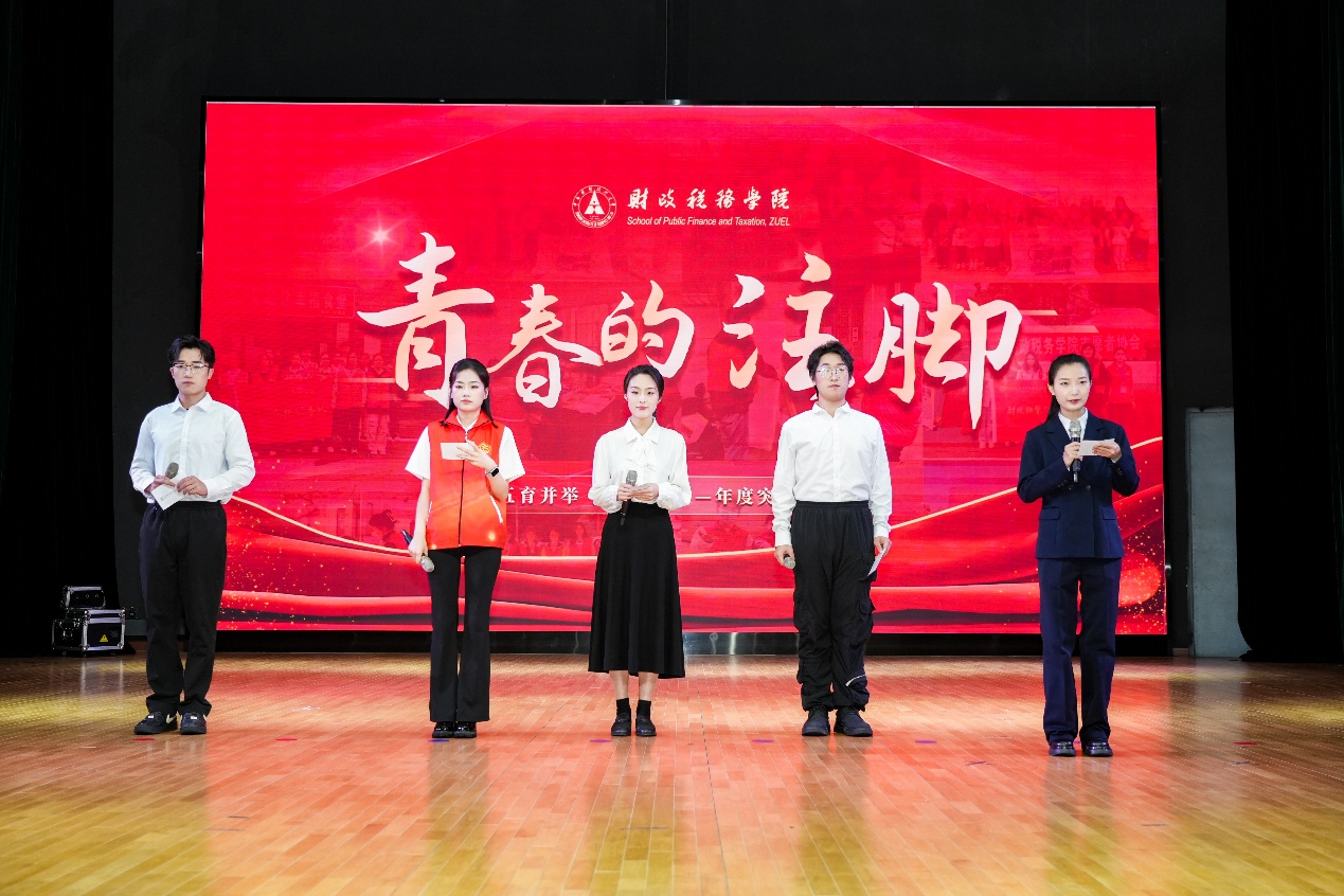 获奖团队代表联袂带来快闪节目《青春的注脚》。同学们依次分享了各自团队在不同领域的奋斗经历,生动呈现了学院五育并举育人体系的丰硕成果,也深刻诠释了新时代财税青年将个人成长与时代发展同频共振的价值追求。