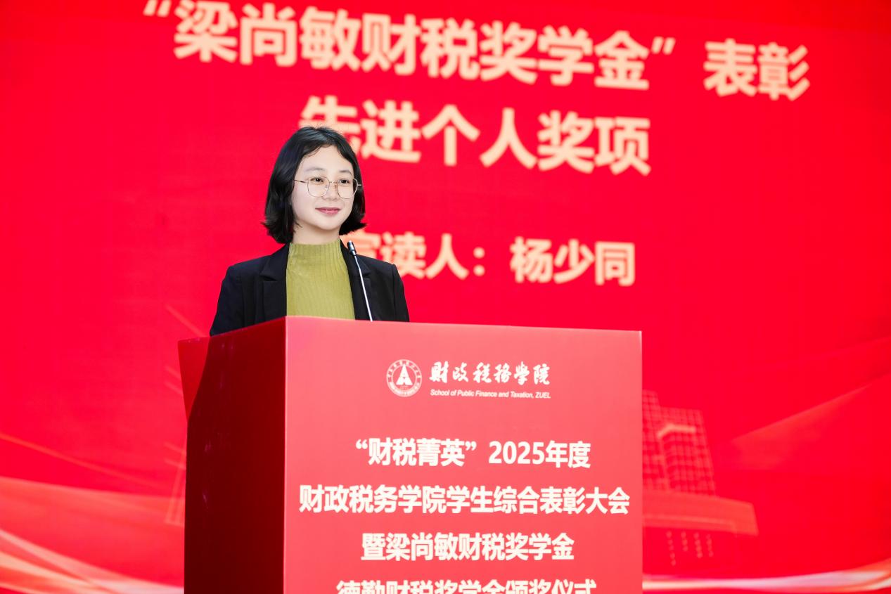 杨少同宣读2025年度梁尚敏财税奖学金先进个人奖项获奖名单,并由白雷、郝新春、屈代洲、邓松为获得“学习之星”“科研之星”“志愿之星”“文体之星”“实践之星”荣誉称号的先进个人颁奖。
