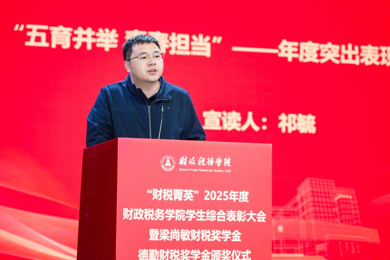 为深入贯彻党的二十大和二十届历次全会精神,落实教育强国建设和新时代立德树人工程要求,切实发挥优秀榜样示范引领作用,激励全体财税师生以昂扬斗志、务实作风,投身以中国式现代化全面推进强国建设的伟大实践,4月9日下午,“财税菁英”2025年度财政税务学院学生综合表彰大会暨梁尚敏财税奖学金、德勤财税奖学金颁奖仪式在艺体中心音乐厅顺利举行。