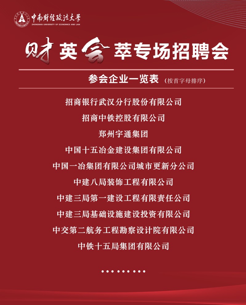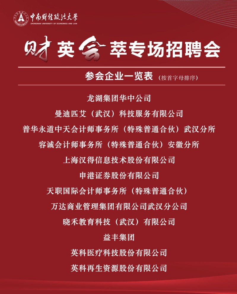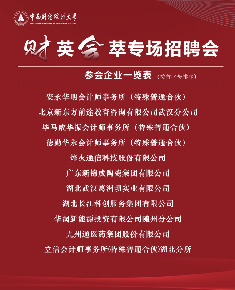 为发挥学院学科资源优势,精准对接学生和用人单位需求,推进毕业生高质量充分就业,中南财经政法大学就业指导服务中心、财政税务学院、会计学院联合举办文澜职汇之“财”英“会”萃专场招聘会,具体安排如下: