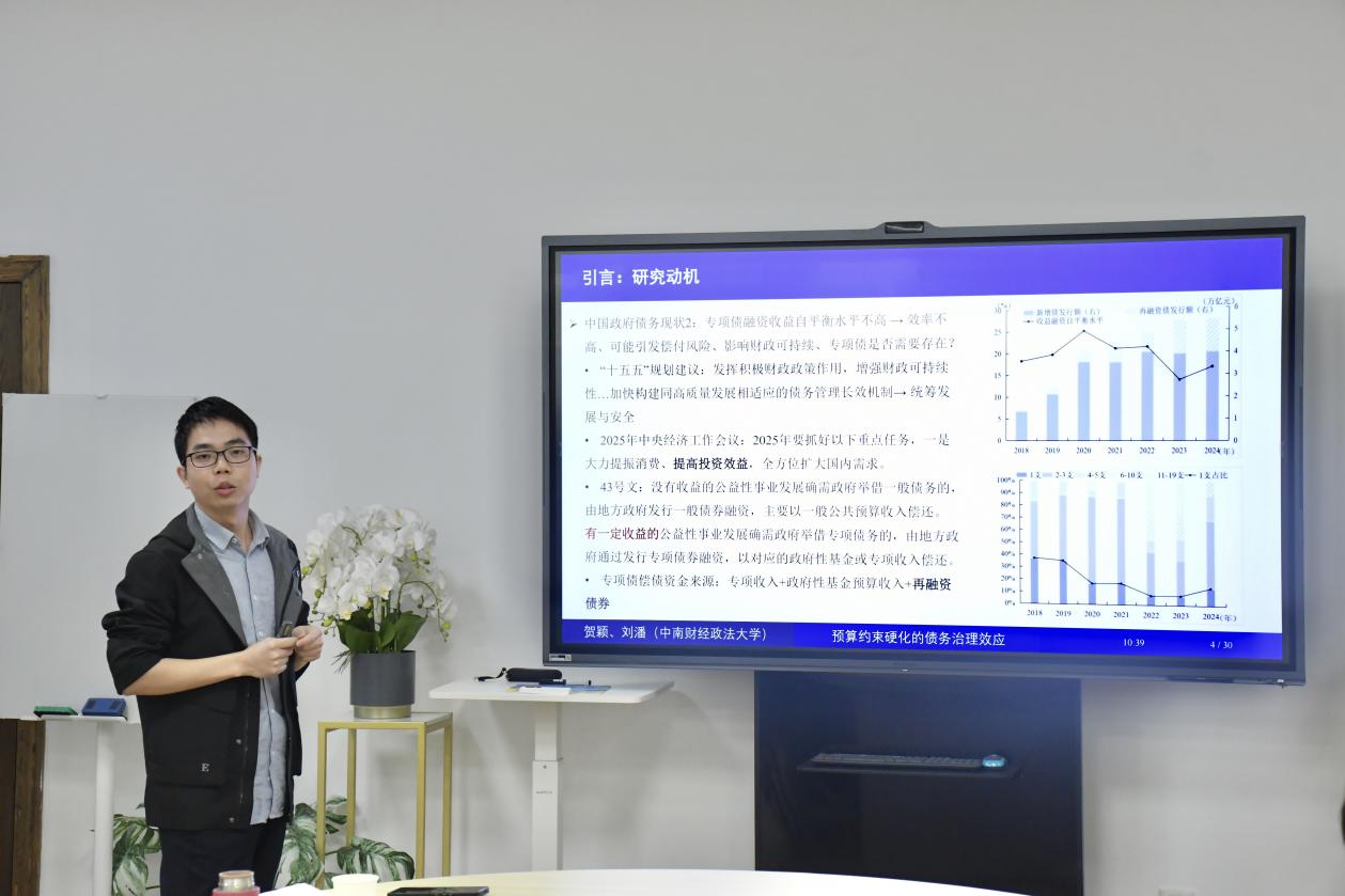11月7日上午,第71期“财”思泉涌·学术研讨会于文泉楼北504会议室顺利举行。本次研讨会邀请到了中南财经政法大学财政税务学院刘潘副教授带来题为“预算约束硬化的债务治理效应:地方政府专项债偿付方式的视角”的学术报告。会议由财政税务学院王筱筱老师主持,学院部分教师及研究生共同参与了本次会议。