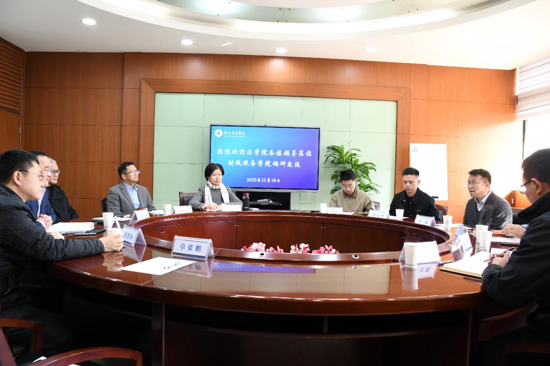侯猛对我院的精心接待表示衷心感谢,并高度肯定了学院悠久的学科历史与强劲的团队实力。他系统介绍了法学学科发展的特色路径与优势,明确了两院深化跨学科合作的重要意义与方向。希望双方以此次交流为契机,在学校财经政法深度融通的大背景下,将现有学者间的个人合作升级为两院层面相关学科的有组织科研,在交叉学科建设、复合型人才培养等领域建立长效合作机制,共同推动两院学科深度融通。