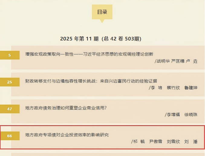 近日,中南财经政法大学财政税务学院副院长祁毓教授及其合作者(尹傲雪,中南财经政法大学财政税务学院博士研究生;刘雪欣,中南财经政法大学财政税务学院博士研究生;刘潘,中南财经政法大学财政税务学院副教授)的研究成果“地方政府专项债对企业投资效率的影响研究”在国内权威期刊《数量经济技术经济研究》2025年第11期正式发表。