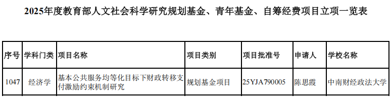 近日,教育部发布了《教育部社科司关于2025年度教育部人文社会科学研究一般项目立项的通知》,财政税务学院陈思霞教授申报的课题“基本公共服务均等化目标下财政转移支付激励约束机制研究”获得规划基金项目立项。