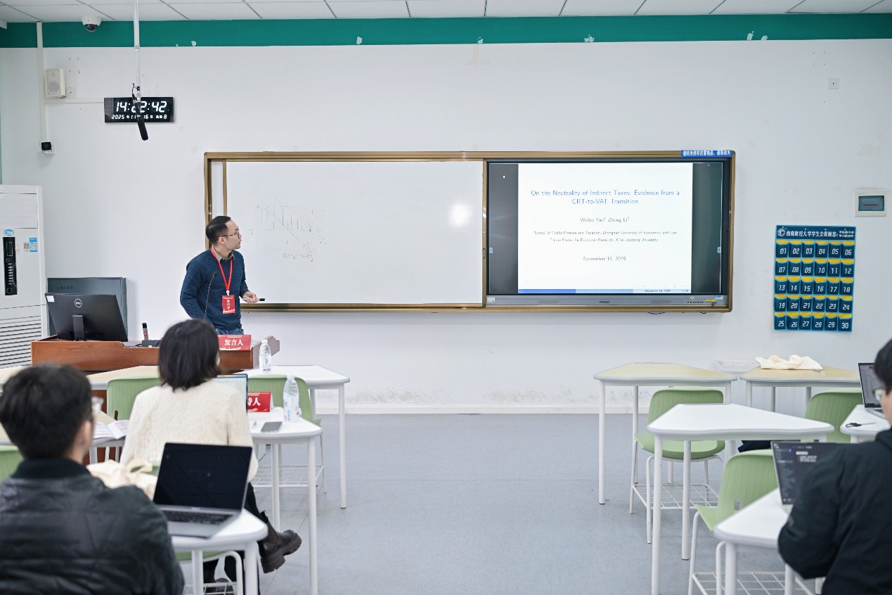 2025年11月15日至16日,鄢伟波副教授受邀参加了由当代经济学基金会与西南财经大学经济学院共同主办的“当代经济学博士创新项目证书授予仪式暨2025年中国青年经济学家论坛”,并汇报了学术论文《On the Neutrality of the Indirect Taxes》,与参会学者就国补的价格效应、新能源汽车购置税补贴和超级明星企业税负等财税领域前沿议题进行了深入讨论和交流。