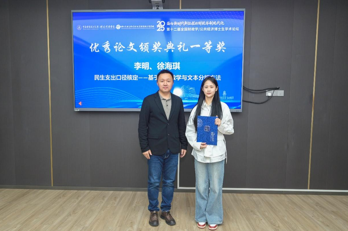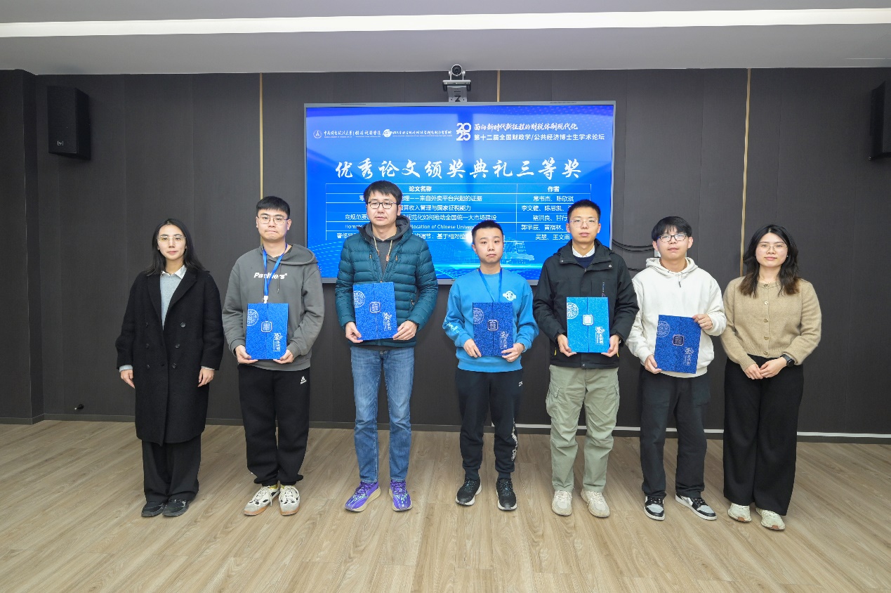经过一天的发言与点评后,中南财经政法大学第十二届全国财政学/公共经济博士生学术论坛圆满落下帷幕。论坛闭幕式于文泉楼北415会议室举行,财政税务学院团委副书记钟唯主持闭幕式。学院副院长田彬彬教授致闭幕词并宣读获奖名单,随后举行了优秀论文颁奖典礼。至此,中南财经政法大学第十二届全国财政学/公共经济学博士生学术论坛正式闭幕。期待与各位博士生在下届论坛再聚武汉,相约中南财经政法大学,共赴更加精彩的学术盛典!