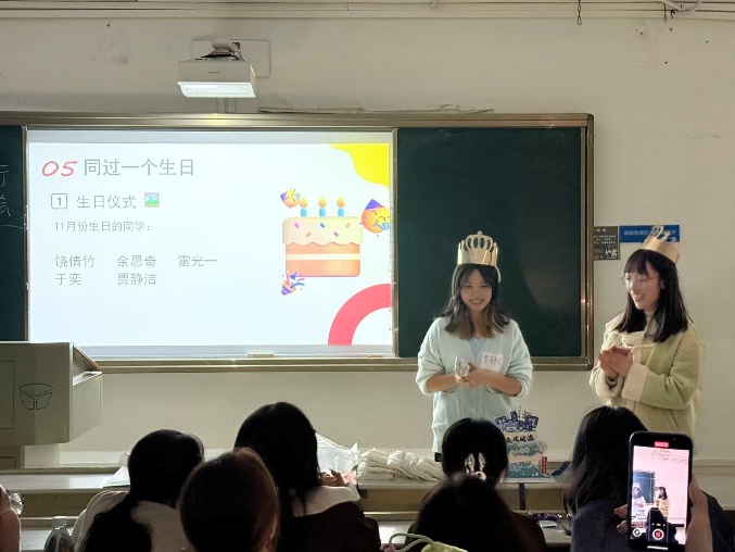 随后进行的“共想班会”环节汇集了集体智慧。各小组围绕“积极向上、团结互助”的主题展开热烈讨论,并派代表上台展示。经全体投票,最终确立了“精研财税,笃行致远;团结奋进,不负今朝”的班级口号。紧接着,班会进入了“减压舒缓好歌推荐”环节,播放了由同学们提前票选出的暖心歌曲,并为推荐者颁发了奖品,悠扬的旋律进一步舒缓了大家的心情。活动的高潮是特别设置的“同过一个生日”环节,为11月生日的同学们和这个新组建的集体共同庆生。烛光摇曳中,大家齐唱生日歌、共同许愿,并将写满祝福的便利贴精心贴在海报的“心”形区域内,凝聚了浓浓的同窗情谊。