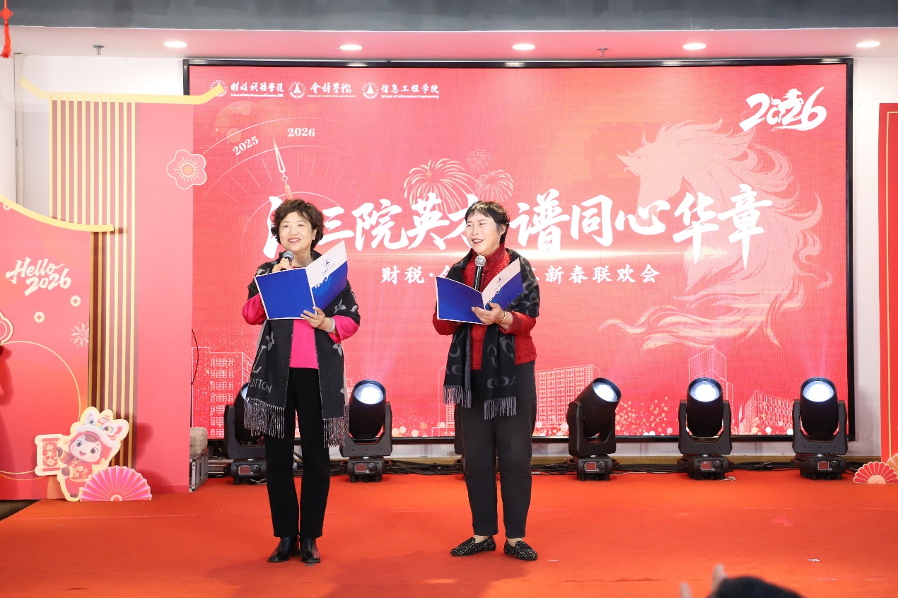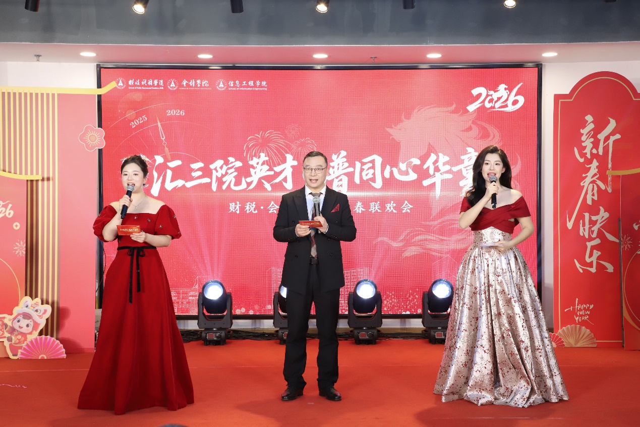 龙腾祥云辞旧岁,院系同心迎新春。财政税务学院、会计学院、信息工程学院于1月16日晚在望湖食堂联合举办“汇三院英才,谱同心华章”新春联欢会。三院教职工齐聚一堂,在轻松欢愉的氛围中共叙情谊、共展才艺、共迎新春,呈现了一场兼具学科特色与人文温度的视听盛宴。
