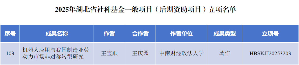 近期,中南财经政法大学财政税务学院王宝顺教授获得2025年湖北省社科基金一般项目(后期资助项目)立项。具体立项情况如下: