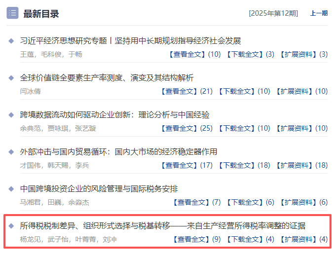 近日,中南财经政法大学财政税务学院叶菁菁教授(通讯作者)及其合作者(杨龙见,中央财经大学财政税务学院教授;武子怡,中国人民大学财政金融学院;刘冲,北京大学经济学院长聘副教授)的研究成果“所得税税制差异、组织形式选择与税基转移——来自生产经营所得税率调整的证据”在顶级期刊《经济研究》2025年第12期正式发表。