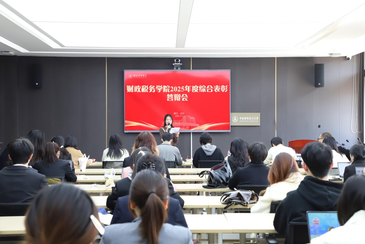 (通讯员韩睿子 摄影 顾立雅)3月12日下午,财政税务学院2025年学生年度综合表彰答辩会在文泉楼北415会议室隆重举行。校党委组织部董晓清老师、校党委宣传部陈俊华老师、校党委学生工作部刘祚衡老师、校团委胡瑢老师、校本科生院曾洁老师、校就业指导服务中心郭婉钰老师应邀出席并担任评委。财政税务学院党委书记徐警武、副书记杨少同、各年级辅导员及学生代表共同参加了此次活动。