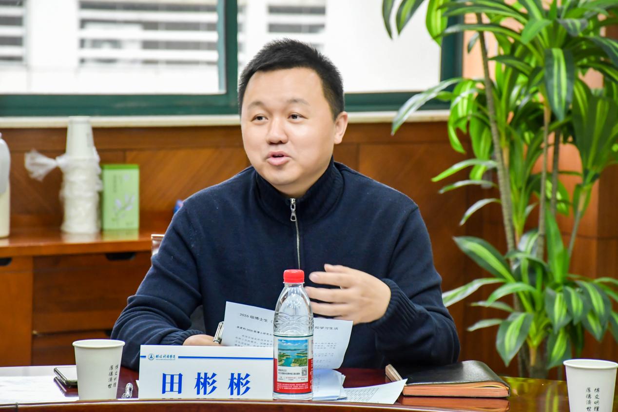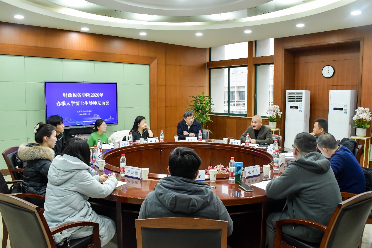 为切实做好2026年春季预录取博士生培养衔接工作,帮助新生快速融入学院学术氛围、明确科研方向,财政税务学院首届春季预录取博士生导师见面会于3月16日下午在文泉楼北603会议室顺利举行。学院党委书记徐警武、副院长田彬彬、博士生导师金荣学、陈高,博士生辅导员钟唯、研究生教学秘书翟紫薇及2026级预录取博士生代表参与本次见面会,共话学术成长,共绘研途蓝图。田彬彬副院长主持活动。