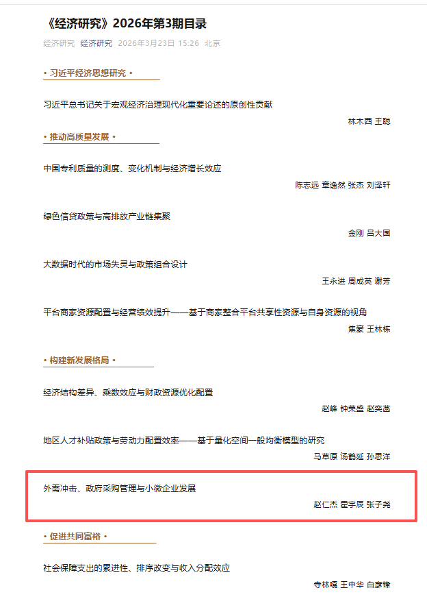 近日,中南财经政法大学财政税务学院张子尧副教授(通讯作者)及其合作者(赵仁杰、霍宇辰,西北大学经济管理学院)的研究成果“外需冲击、政府采购管理与小微企业发展”在国内顶级期刊《经济研究》2026年第3期正式发表。