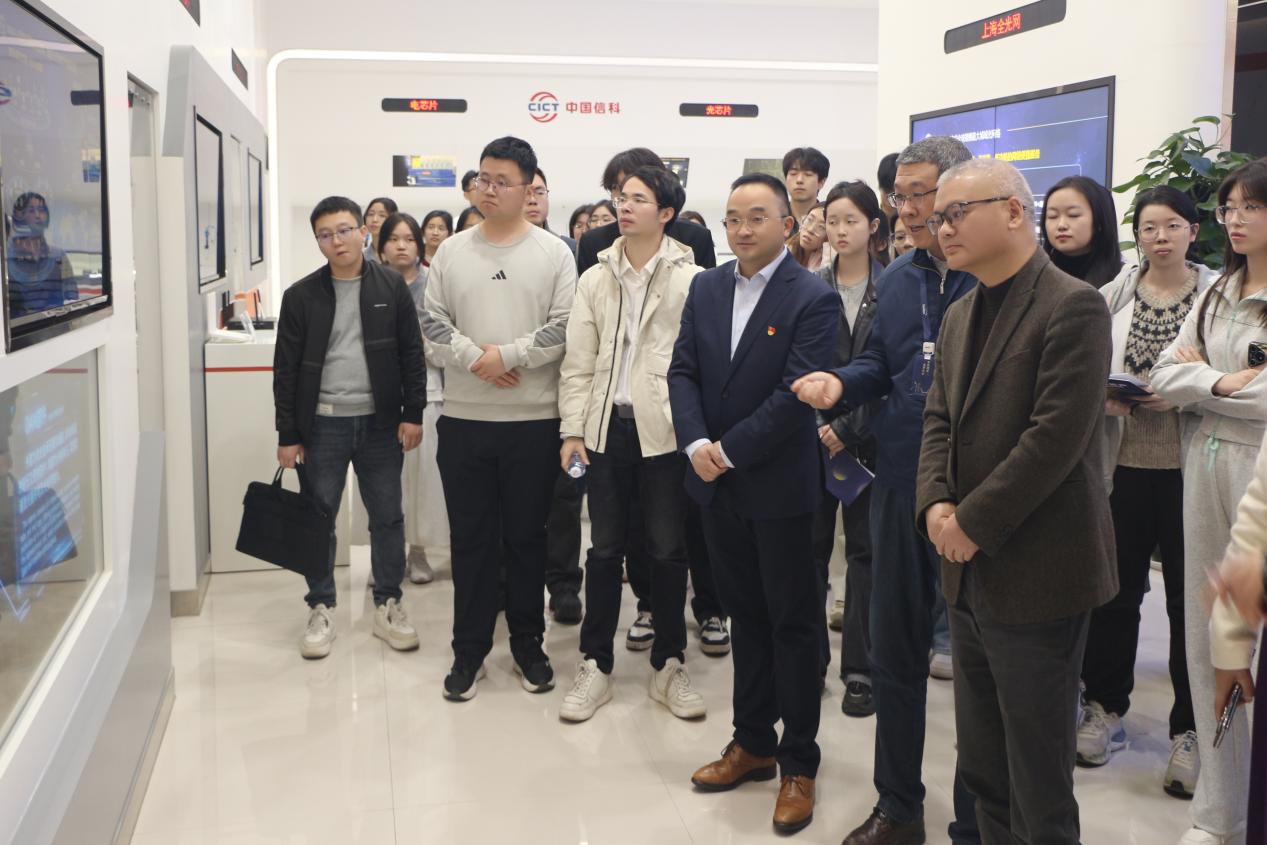 在企业讲解员的引导下,师生一行先后参观中国信科集团展厅与光通信陈列馆。在集团展厅,大家系统了解企业发展历程、核心技术成果与“空天地海”一体化通信解决方案,认真学习习近平总书记关于科技创新的重要论述,深刻感悟央企服务国家战略、坚持科技自立自强的使命担当。在光通信陈列馆,师生们重温我国光通信产业从无到有、从弱到强、打破国外技术封锁的奋斗历程,近距离感受一代代科研工作者攻坚克难、实业报国的精神力量,接受了一堂生动的科技创新与爱国主义实践教育课。